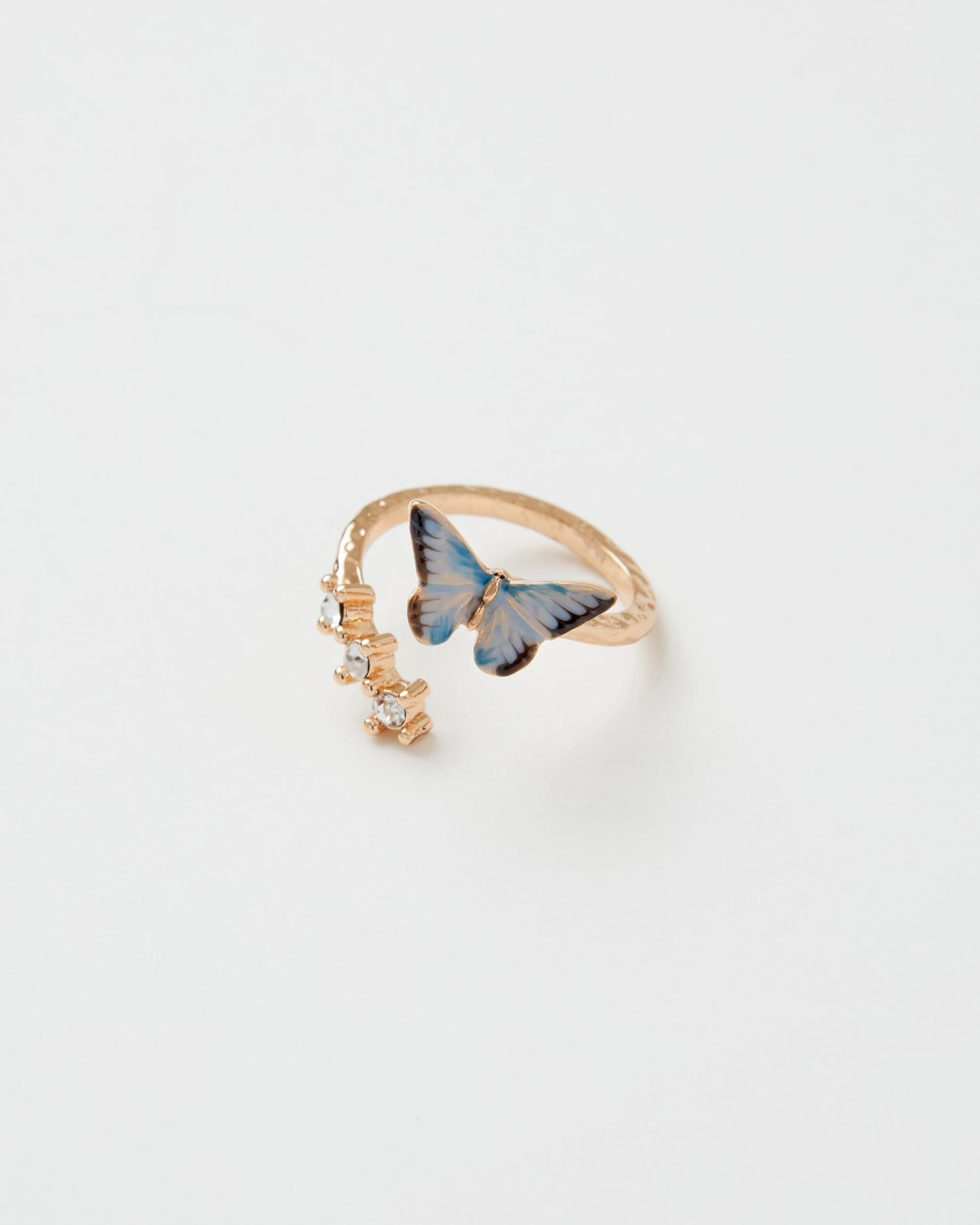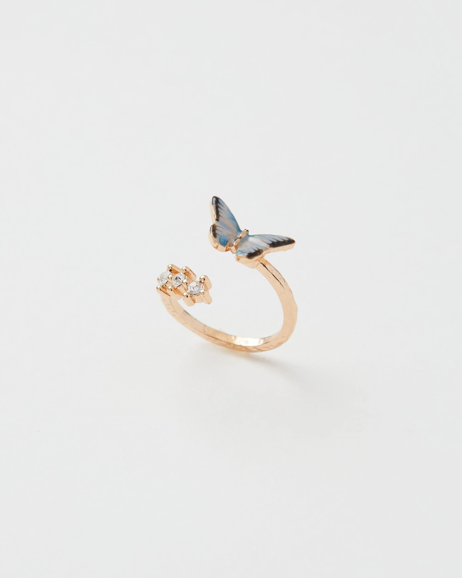 Featuring our blue butterfly charm amongst sparkly clear gems, this ring, made from durable brass, can be squeezed open and closed to suit the finger of any wearer! Working closely from original vintage botanical illustrations, inspired by our Wonderland theme and Victorian curiosities, this delicately hand-painted enamel butterfly charm represents the freedom of nature and new beginnings.