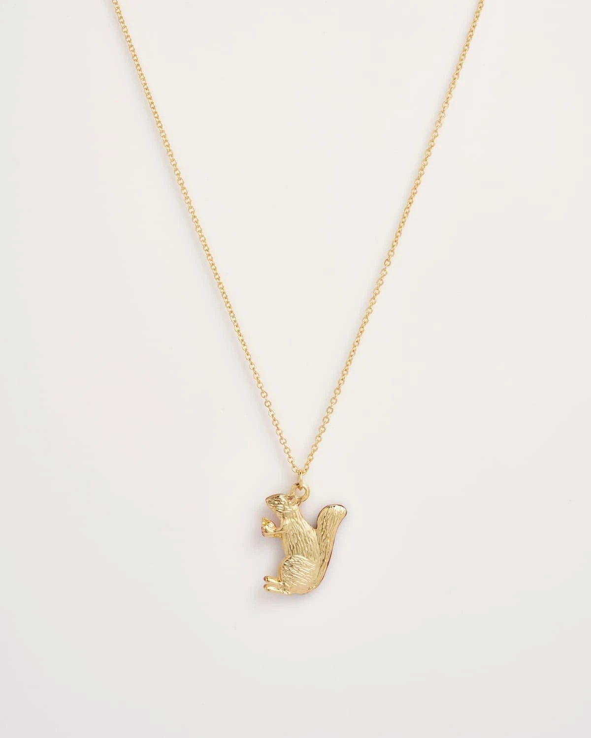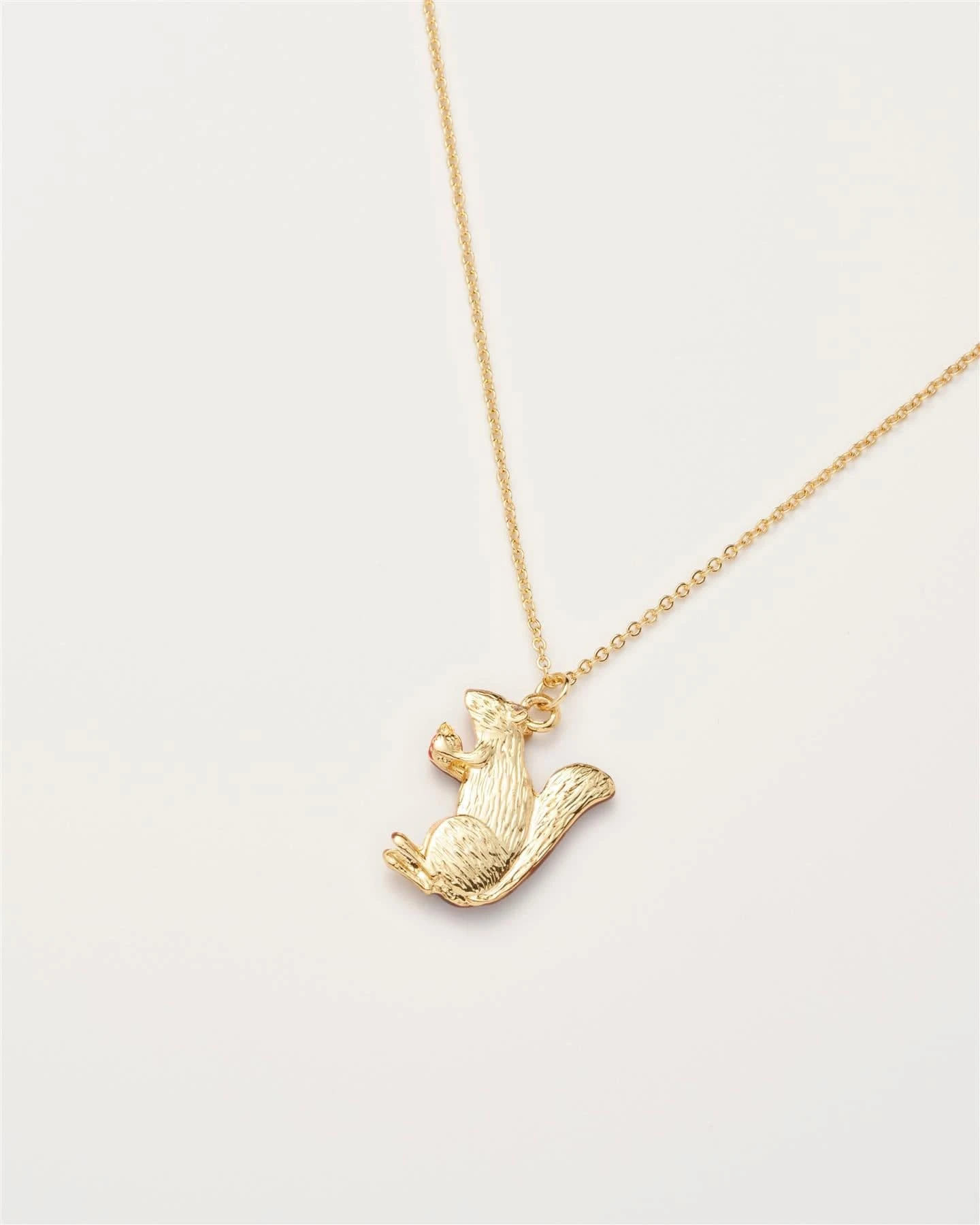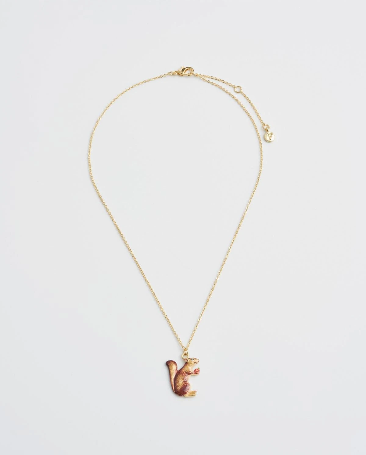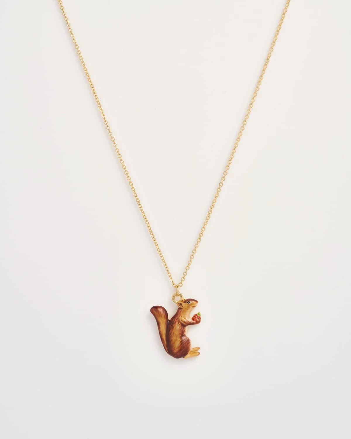 Adorn your décolletage with our Cheeky Squirrel necklace. This playful character, clutching his newly found hoard, is delicately set on a gold-tone chain. Hand-painted and meticulously crafted in eye-catching enamel, this necklace makes the perfect gift for yourself or a nature-loving friend.