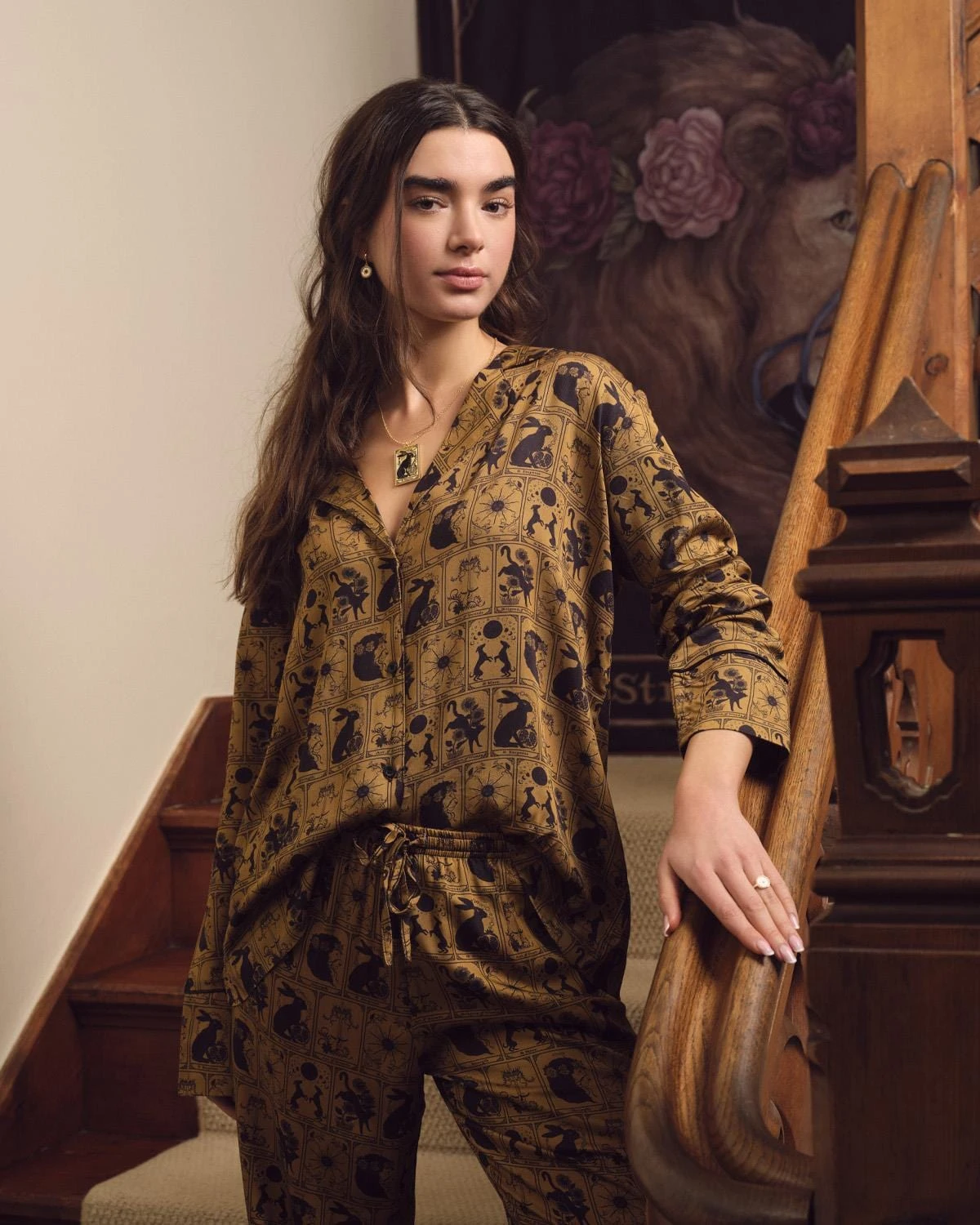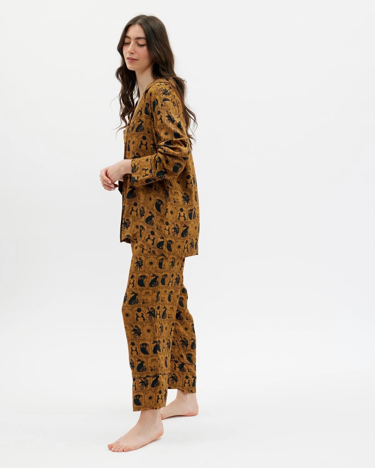 Our classically tailored long pyjama set assures the ultimate comfort and elegance, designed in collaboration with our special guest artist, Jessica Roux, featuring our Tarot Tales print. Expertly crafted from premium viscose satin, exquisitely soft and trimmed with gold piping for a luxury finish. The print combines the wisdom of tarot cards with the enchantment of flora and fauna, creating a unique blend of magic and comfort. These pyjamas promise a restful slumber and a stylish awakening.