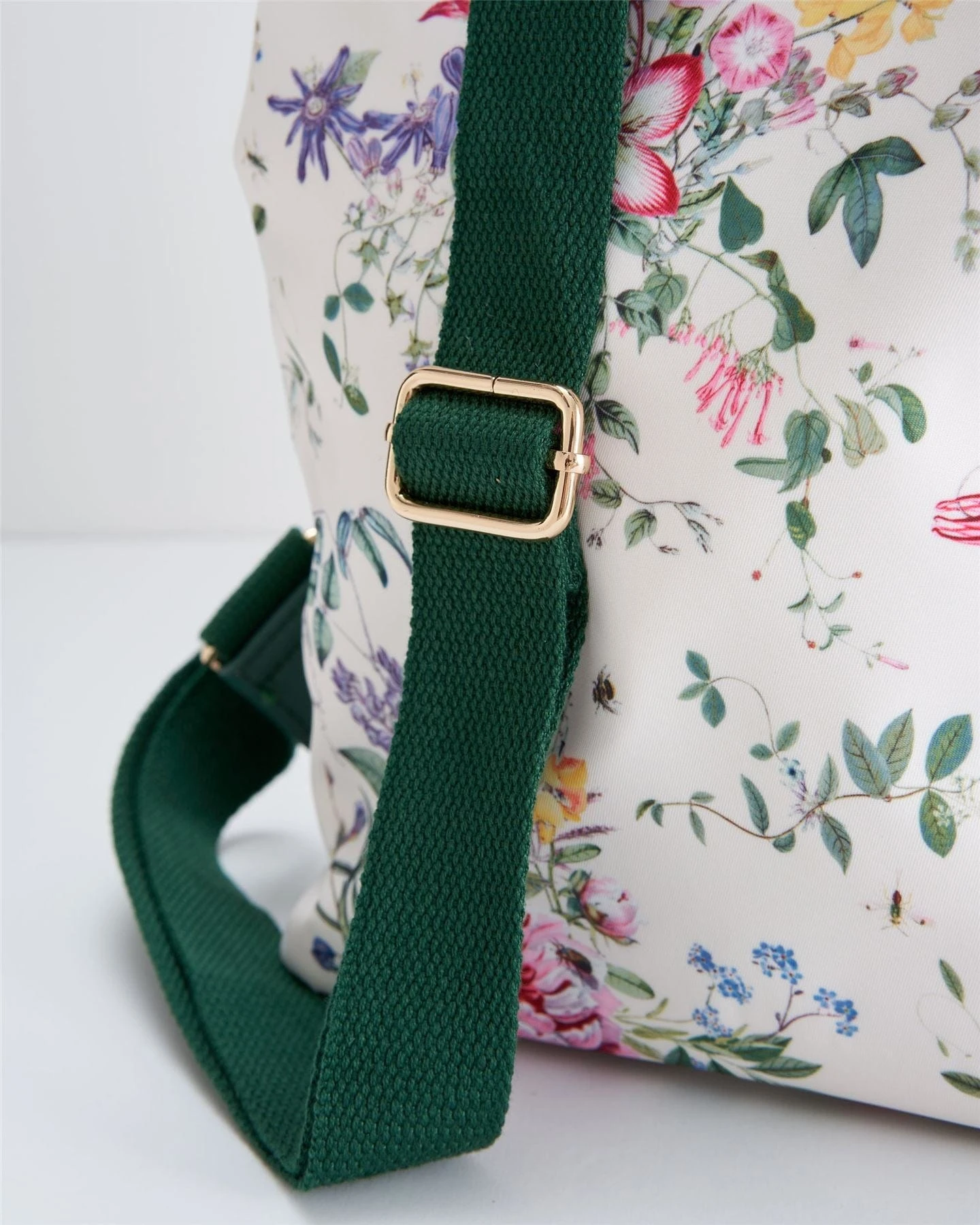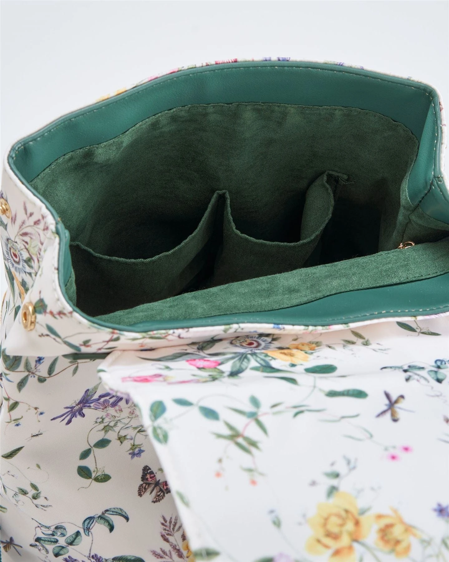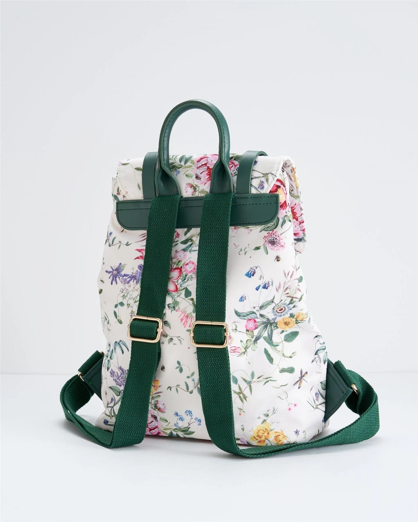 Add a little extra joy to your everyday with our Martha Mini Backpack in our quintessentially British Blooming Toile print. This compact backpack is perfect when you want to travel lighter, but still, have everything in its place. With a zipped front pocket, two inner pockets and a roomy interior it does just that. The addition of buckled, green vegan leather straps adds a touch of vintage charm to this essential everyday piece.
