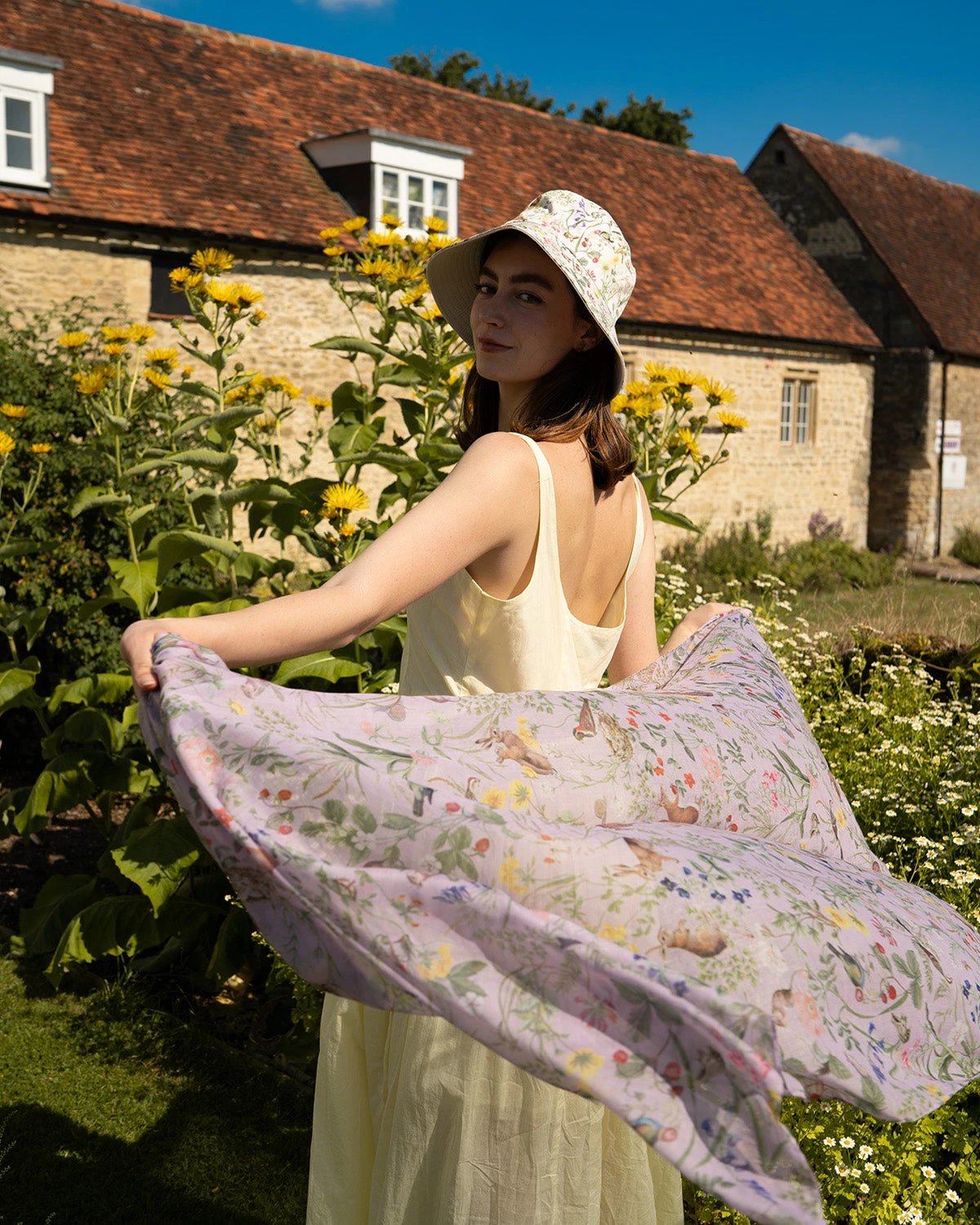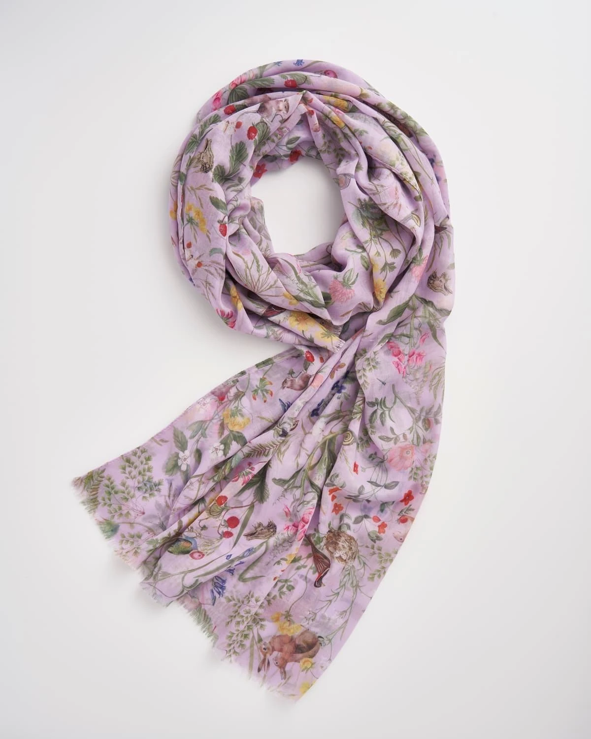 Set amidst the luminous flora, the Lightweight Lilac print scarf from our Meadow Creatures collection sees nature’s furry and feathered friends, frolic and feast, relishing in the blossoming, new days of Spring. An oversized, delicate scarf in a cool, pastel shade is the ultimate accessory to drape yourself in to walk through the meadows, taking in the sweet sound of birdsong. Skilfully crafted in a soft fabric that suits being worn as a neck scarf, cover-up or shawl.