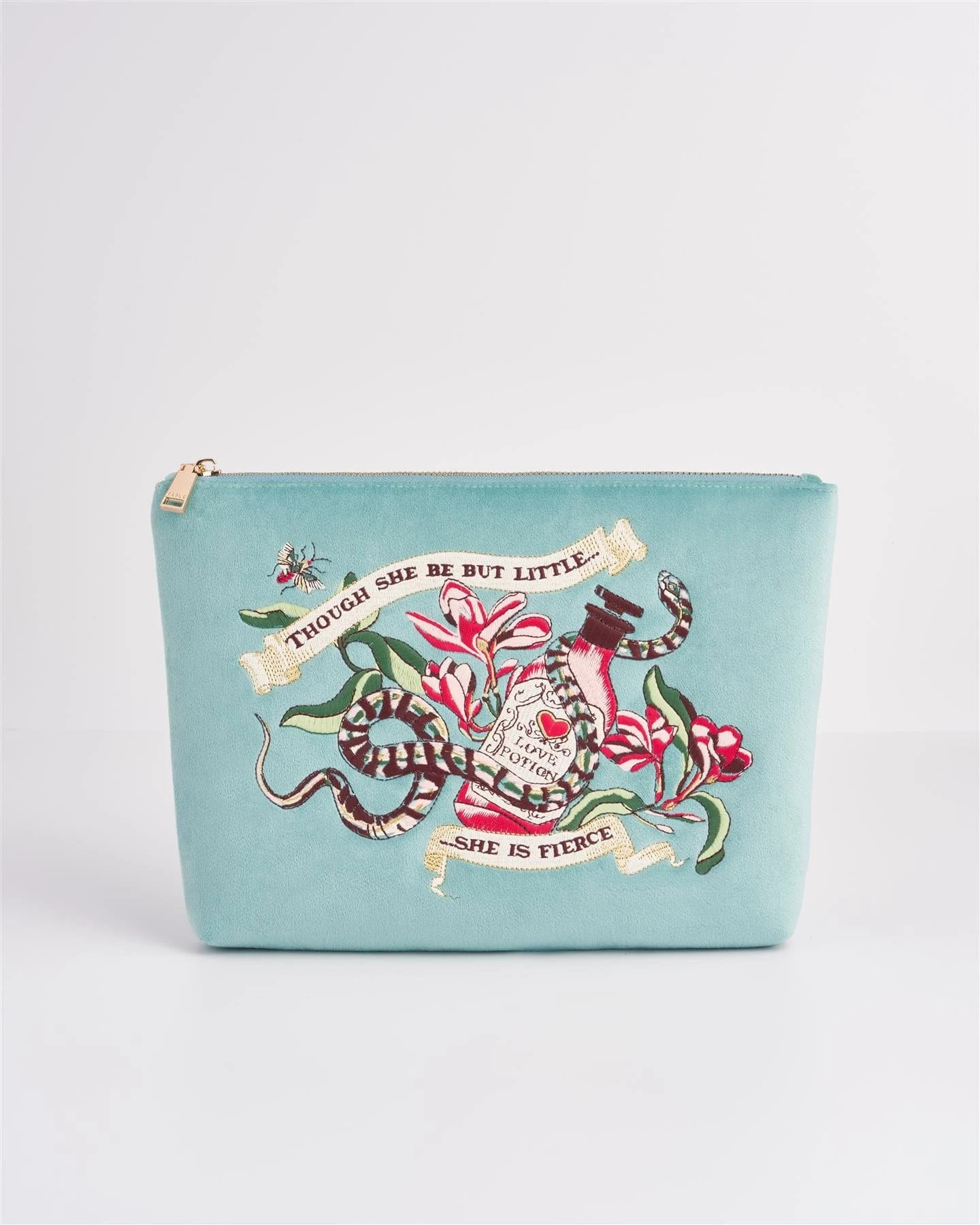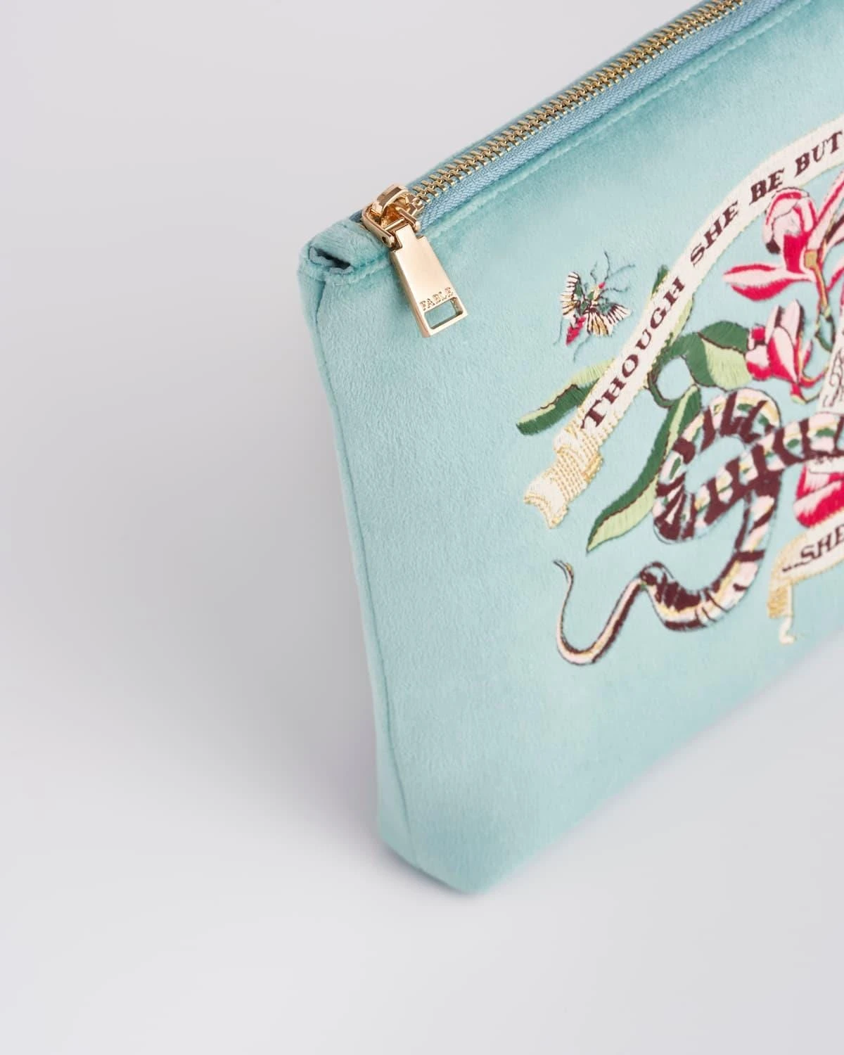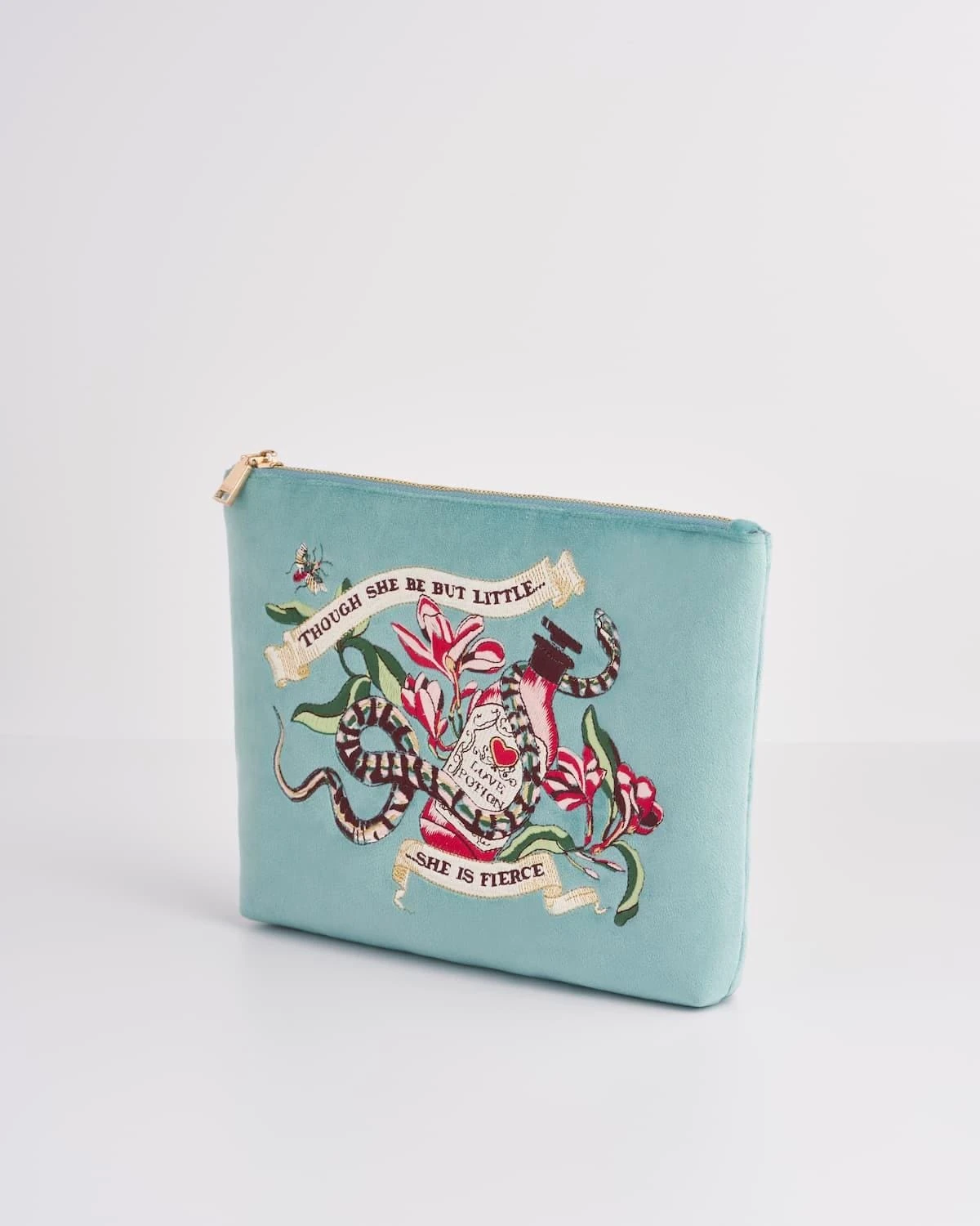 The vintage-inspired Embroidered pouch from our Midsummer Dream collection features embroidered flora and fauna from the play intertwined with the quote “Though she be but little, she is fierce.” With a stylish, gold-tone zip closure along the top, you’ll find this pouch is the ideal size for all your make-up essentials. Expertly crafted, this cosmetics pouch has a luxury velvet finish for an indulgent feel.