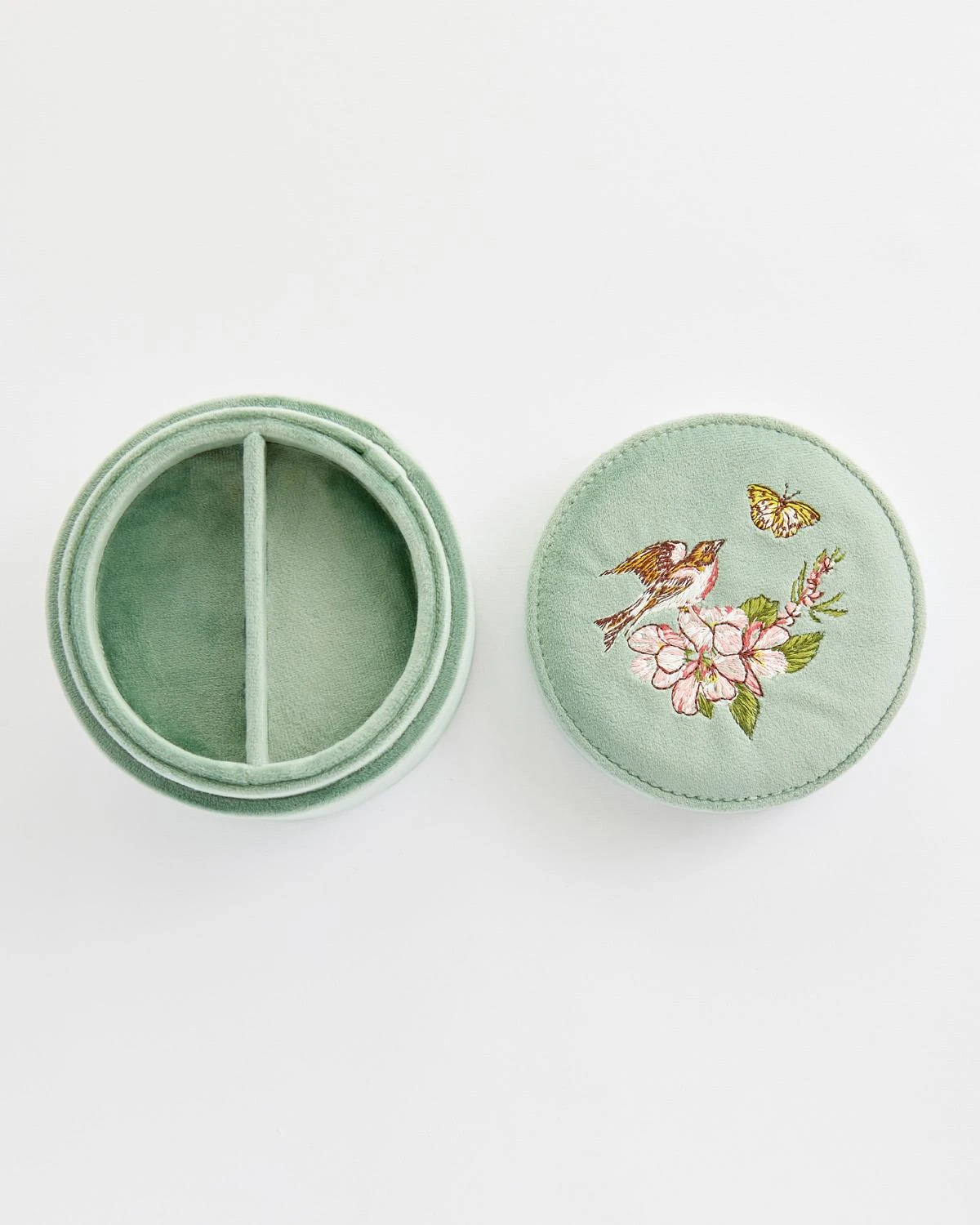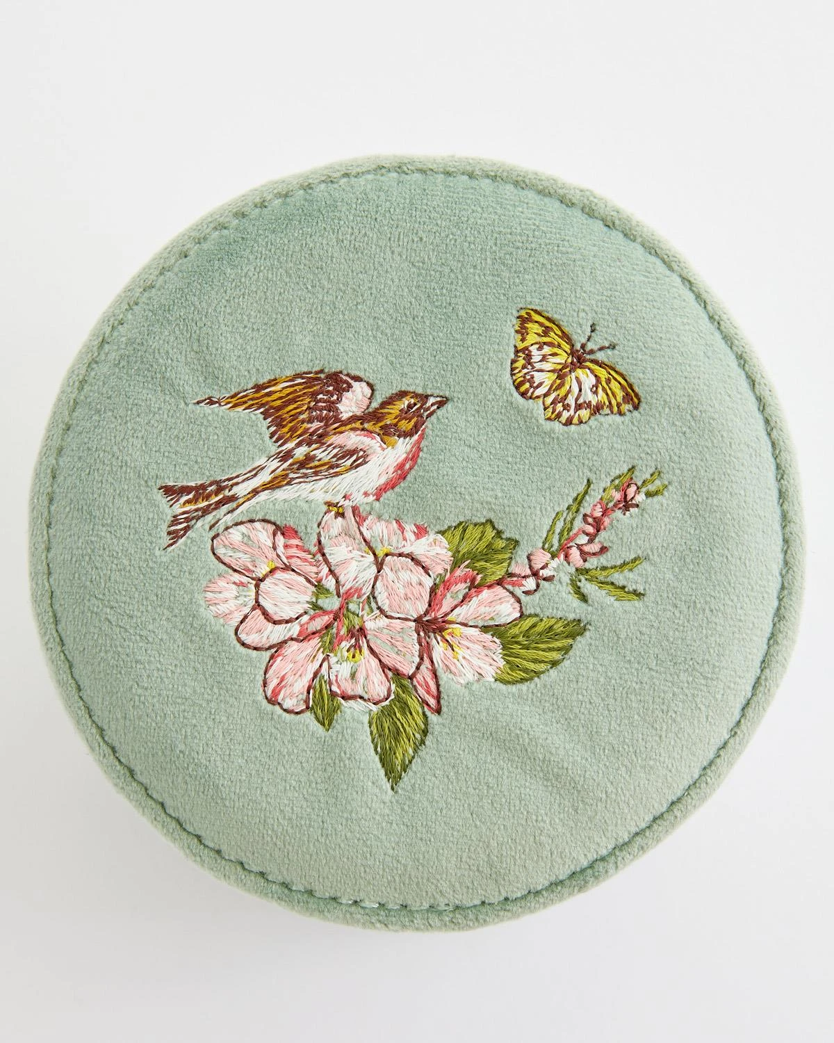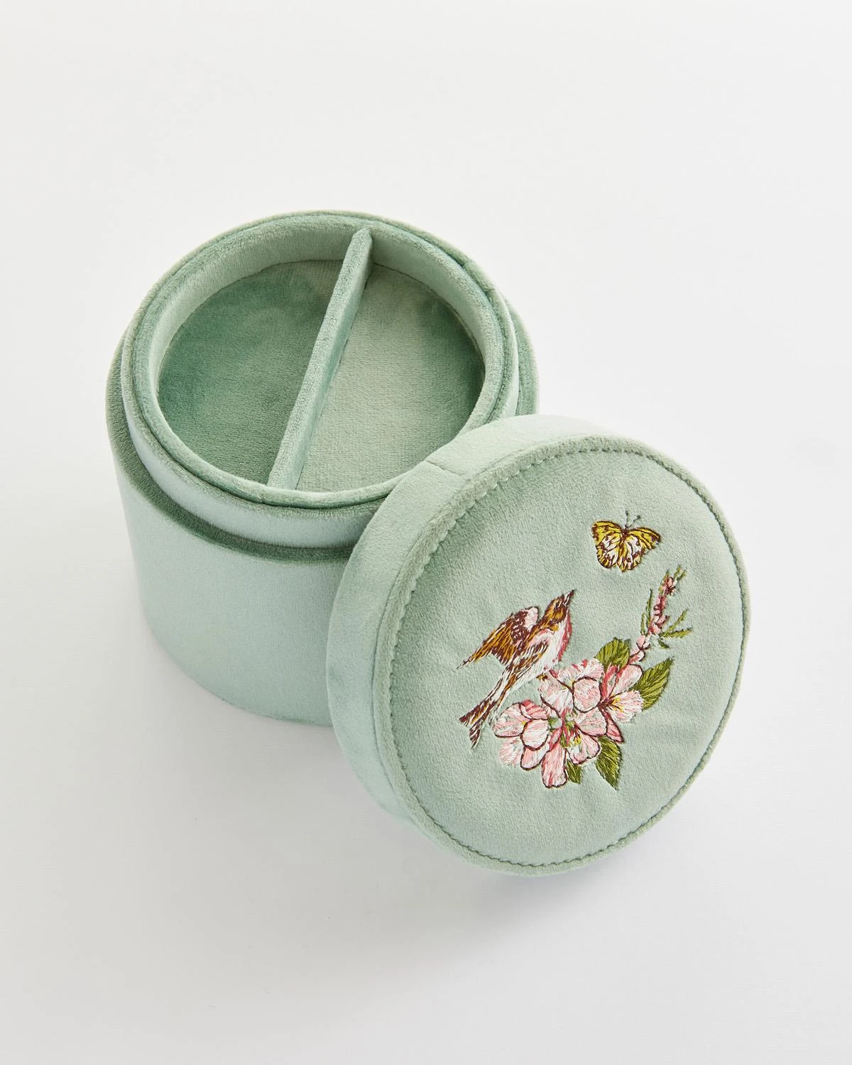 Arising from our hero narrative, Morning Song, symbolising the new season has begun, our expertly crafted Embroidered Round Jewellery Box sets the scene perfectly with our tuneful, feathered friend delicately balancing on a blossoming branch. This compact jewellery box makes the perfect casing to house your most treasured pieces in a safe and stylish way. The rich velvet exudes vintage charm on your dressing table.