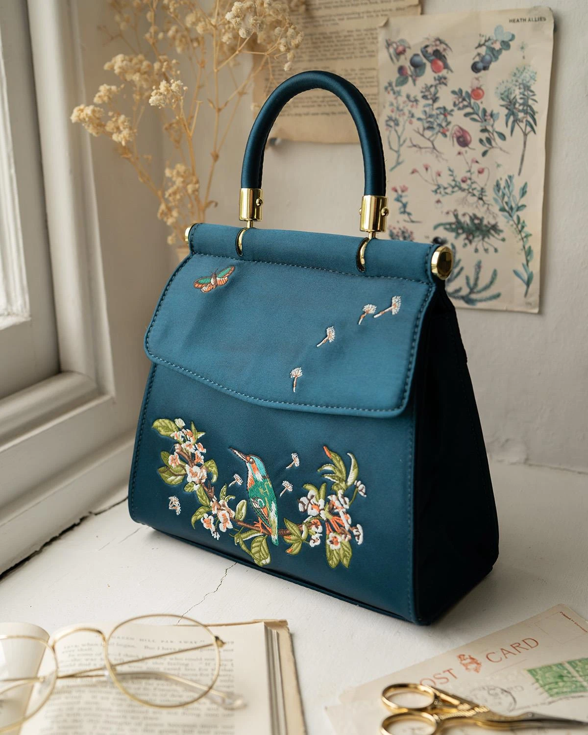 Designed in our hero narrative from our Morning Song collection, our Kingfisher Mini tote in Teal satin is a luxe looking carryall to go with any Spring time outfit. Exquisitely crafted with one of nature’s most fascinating feathered friends, you’ll find you have a new spring in your step every time you carry it. Whether heading out day tripping or for a special occasion, this versatile tote is spacious enough for all your everyday essentials.