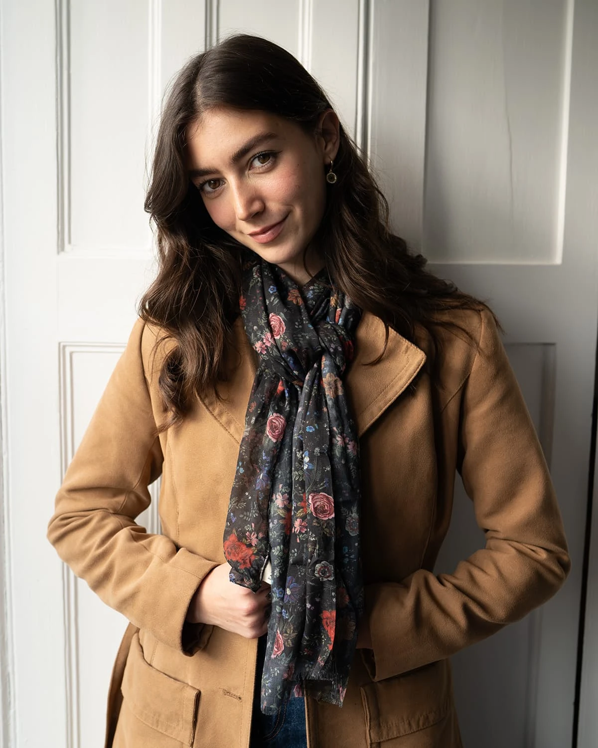 Let the intricate blooms and foliage of our Rambling Floral print enchant you. Whether you’re attending a garden soirée or simply adding a touch of floral charm to your ensemble, this scarf effortlessly elevates your style with its timeless appeal.