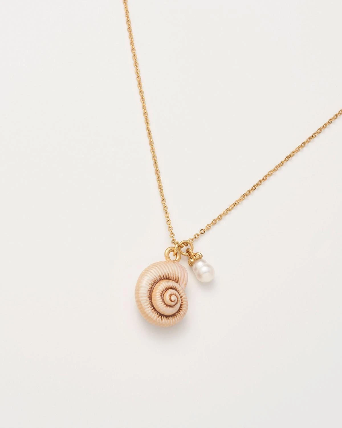 Gift your loved ones this beautifully crafted Sea Snail Shell and Pearl Necklace. Both charms instantly convey your thoughts straight to the seaside and the soft, rolling waves of the ocean. The delicate gold-tone chain with its hanging pendants look tastefully elegant when layered with a longer necklace. Explore Fable’s other seaside inspired charms and start a shell collection of your own.