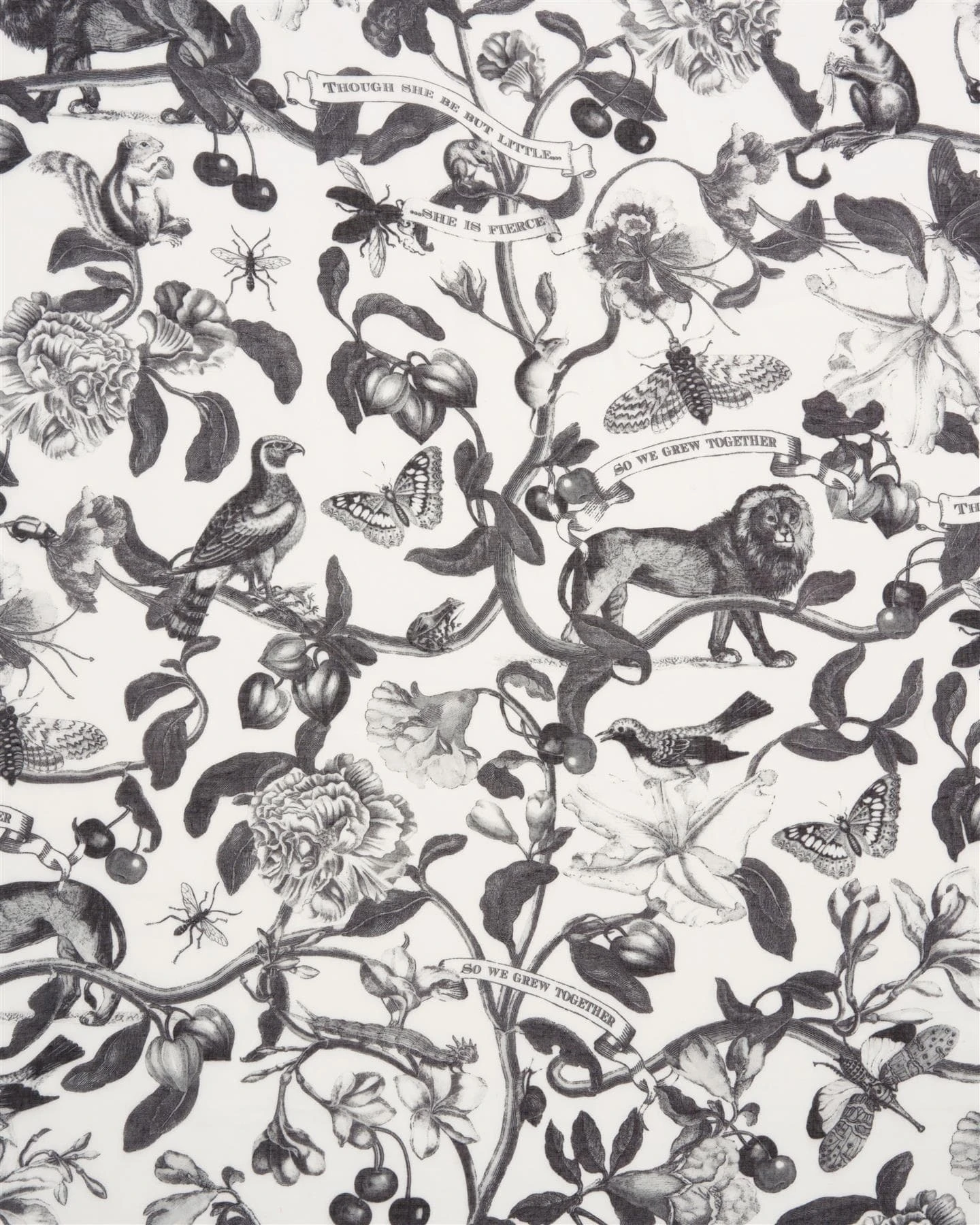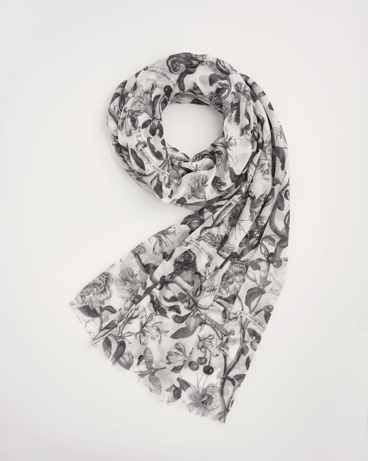 Indulge in the rich tapestry of Shakespearian philosophies and dreamy nature with our Monochrome print lightweight scarf from the Tree of Life collection. This whimsical accessory features delightful creatures, flowing fauna, and worded scrolls, creating a captivating blend of imagery. Crafted from soft, floaty fabric, it can be worn as a neck scarf, cover-up, or shawl, adding a touch of elegance to any contemporary wardrobe.