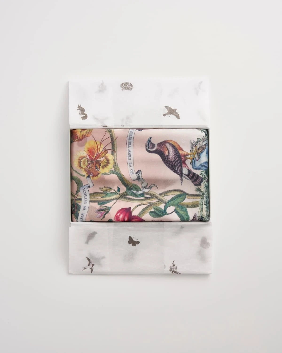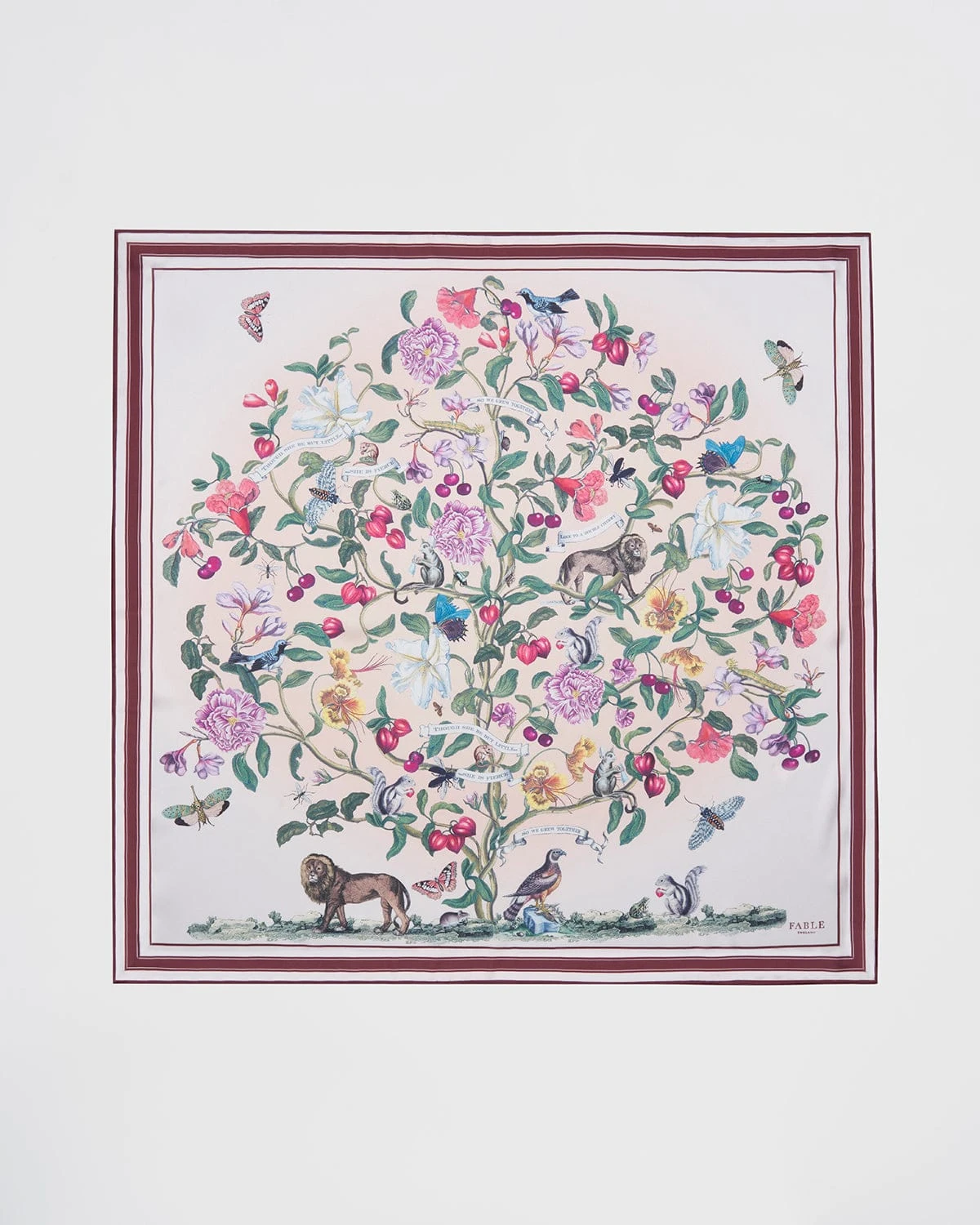 Our dreamy, hero print Tree of Life Narrative Silk Square Scarf depicts the wistful yearnings of the Elizabethan era, evoking notions of indulgent tapestry, mystical storytelling, and illustrating nature’s most treasured creatures. Small poetic scrolls quoting love and creativity fall gracefully across the luxurious scarf, skillfully woven in 100% silk, for a premium, breathable wear. This stylish, magical print can be worn in a number of ways to make the look your own.